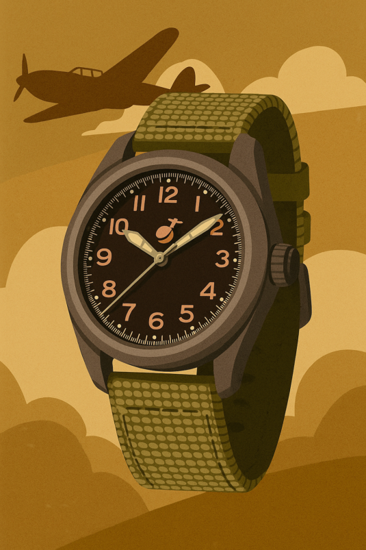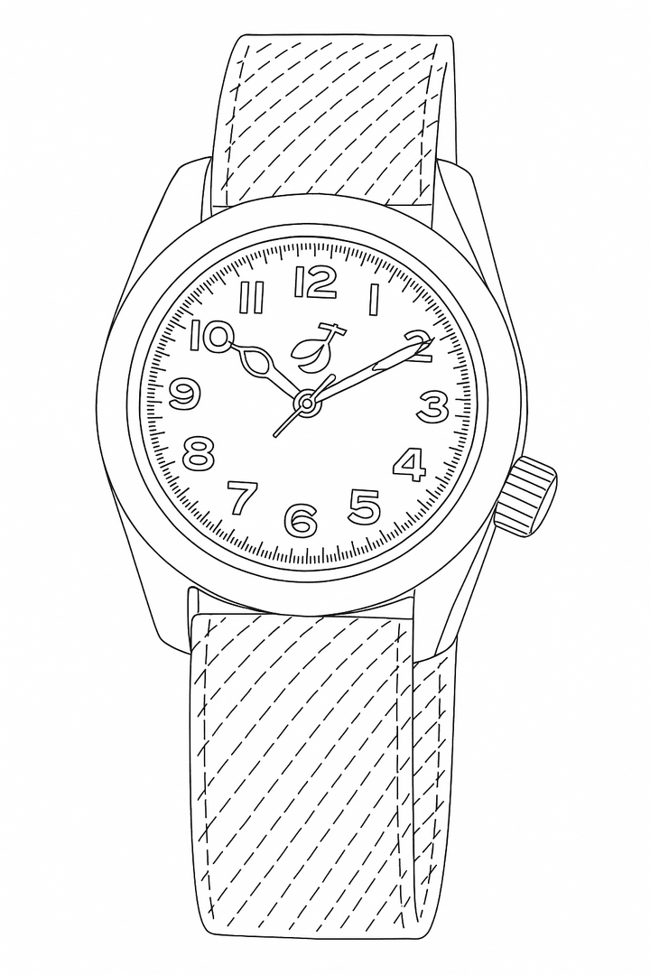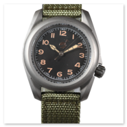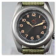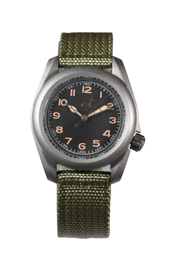 Classic vintage field watch, screw-down case back, screw-down crown offset to 3.8 o'clock position. Nylon strap. Vintage field or pilots dial with luminescent indices and green luminous hands (made with environmentally friendly inactive luminous material).