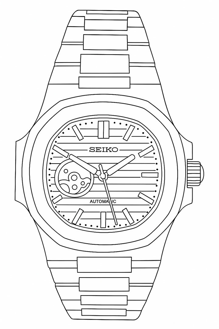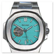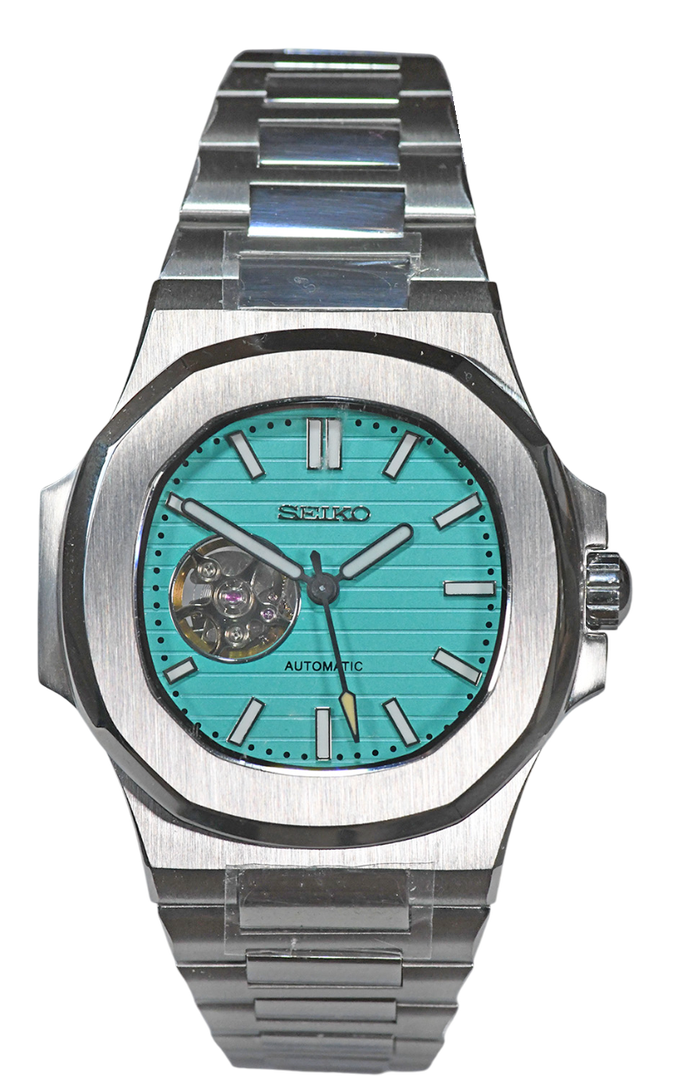 "Nautilus" - Seiko homage. "Open Heart". Very interesting and fascinating mechanical automatic watch in Nautilus design. The caliber (movement) is an NH38a from Seiko (TMI) with visible escapement, known for its quality and longevity. Aluminum dial in Tiffany blue with luminous indexes and luminous hands. Stainless steel case. Sapphire crystal with a virtually scratch-proof surface ensures that the watch will look good for years to come. The screw-in back is fitted with a glass window that provides a view of the movement.