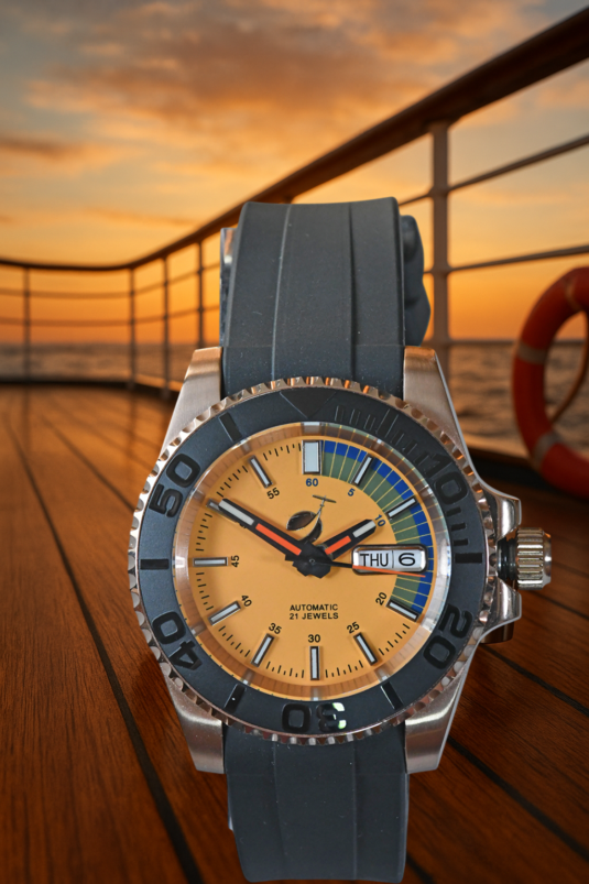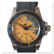 Elegant, sporty and yellow. Automatic watch in a water-resistant stainless steel case (tested to 6 bar) with sapphire crystal (hard - scratch-resistant). Rotating bezel (120 clicks), screwed-in visible back, screwed-in crown, black silicone strap, central second hand, yellow dial with day of the week and date display. Luminescent hands and indices in green (environmentally friendly inactive luminous material).