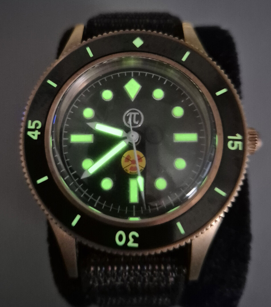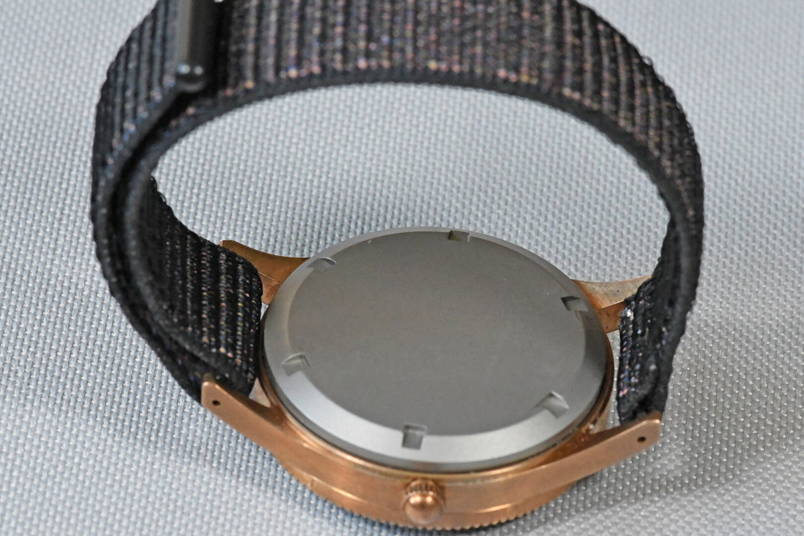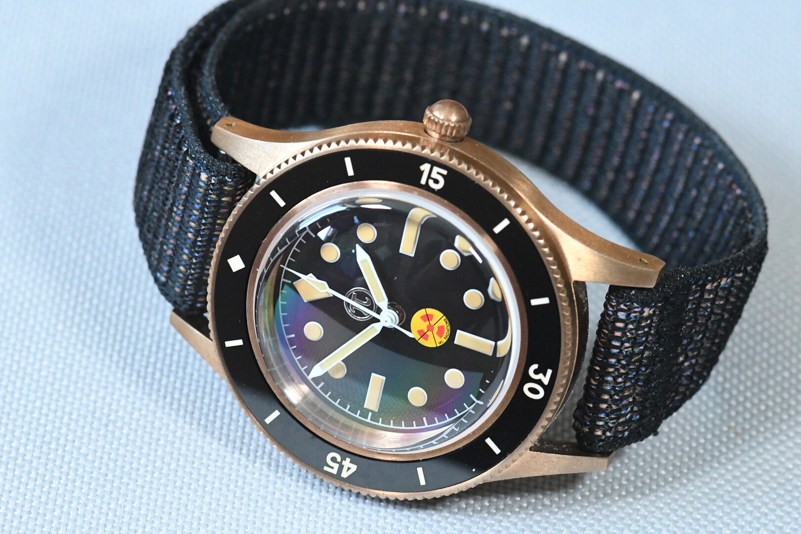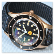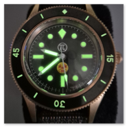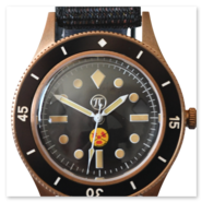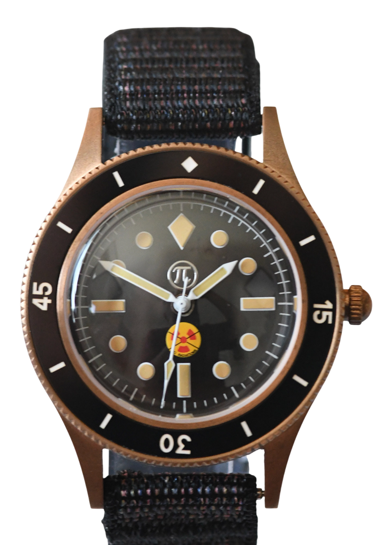 This watch is a reminder of a historic Blancpain watch ("Fitty Fanthoms"* Mil. Spec. 5008-11) from the late 1950s. It was the first diver's watch ever. It was given a coloured nuclear radiation indicator on the dial. The watch glass is made of arched sapphire crystal, the crown can be screwed in. The watch strap is elasticated on a nylon base. A truly rare and beautiful watch. The colour indicator can only be seen as a colourful decoration - it does not have the functionality of the time. The bezel can be turned unidirectional (anti-clockwise) with 120 detentes. This meant that in the event of accidental adjustment, the dive time could only be extended at the setting ring, but not shortened (an important safety factor). Such a rare watch is a real eye-catcher on a man's or woman's wrist. The bronze case and the vintage look of the watch guarantee an elegant appearance. The automatic NH35a movement from Seiko will ensure accurate timekeeping for many years to come.