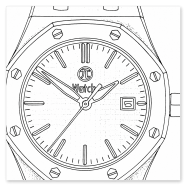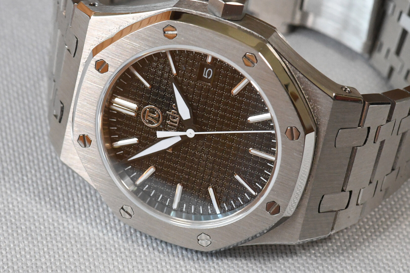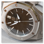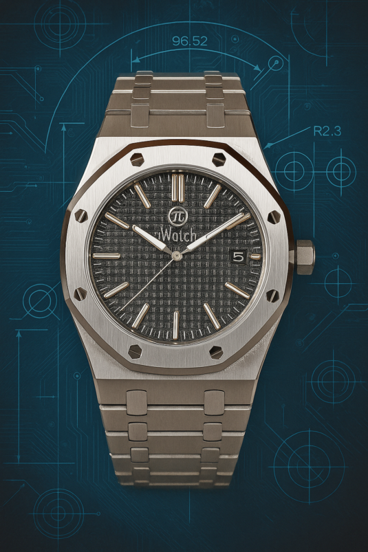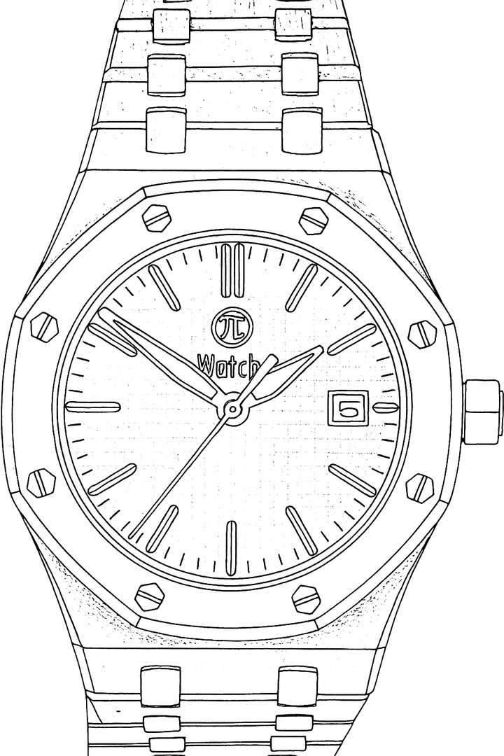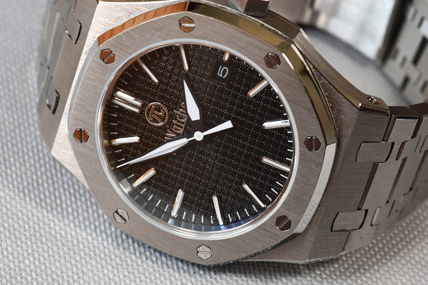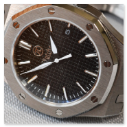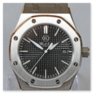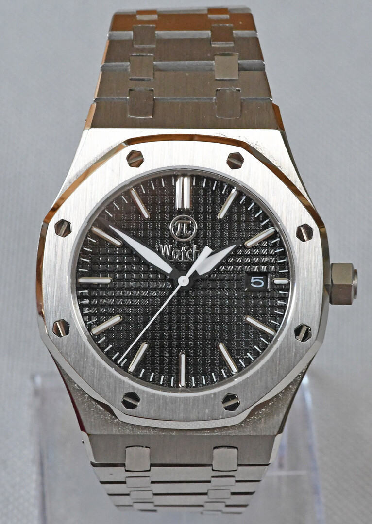 „Royal Oak“ Homage in black. “Royal Oak” was a legendary wristwatch from the luxury watch manufacturer Audemars Piquet in the 1980s. Here I am showing a freely modified design in the classic case, but with a different dial and hands. Stainless steel case with sapphire crystal (very hard - almost unscratchable), exhibition caseback, dial with textured surface, black-white hands, black window for date. Minute and hour hands that glow green in the dark. Bracelet with butterfly clasp.
