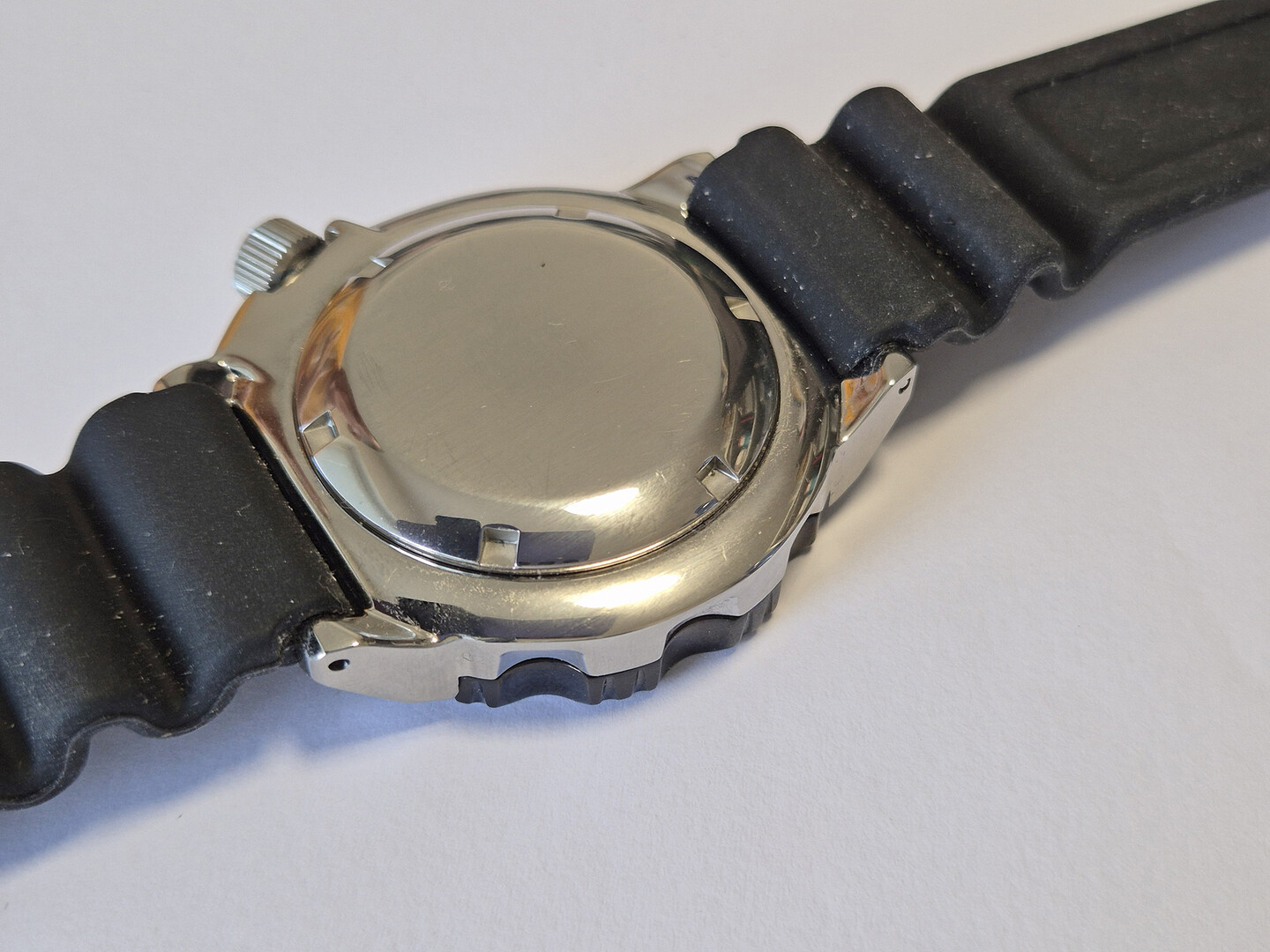 The crown is screw-down and set at 3.8 o'clock. The case back is screw-down. The strap is made of soft, rubber-like material and is soft and supple. It is very comfortable to wear. It is both sporty and elegant.