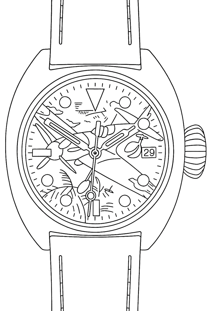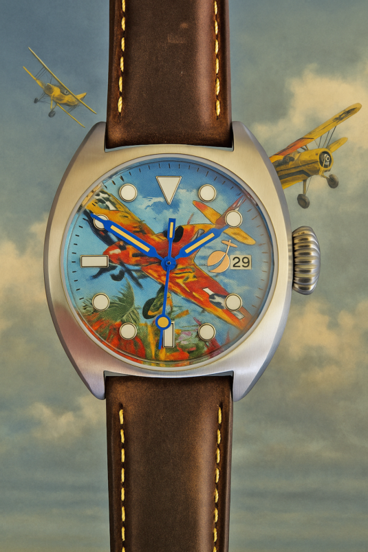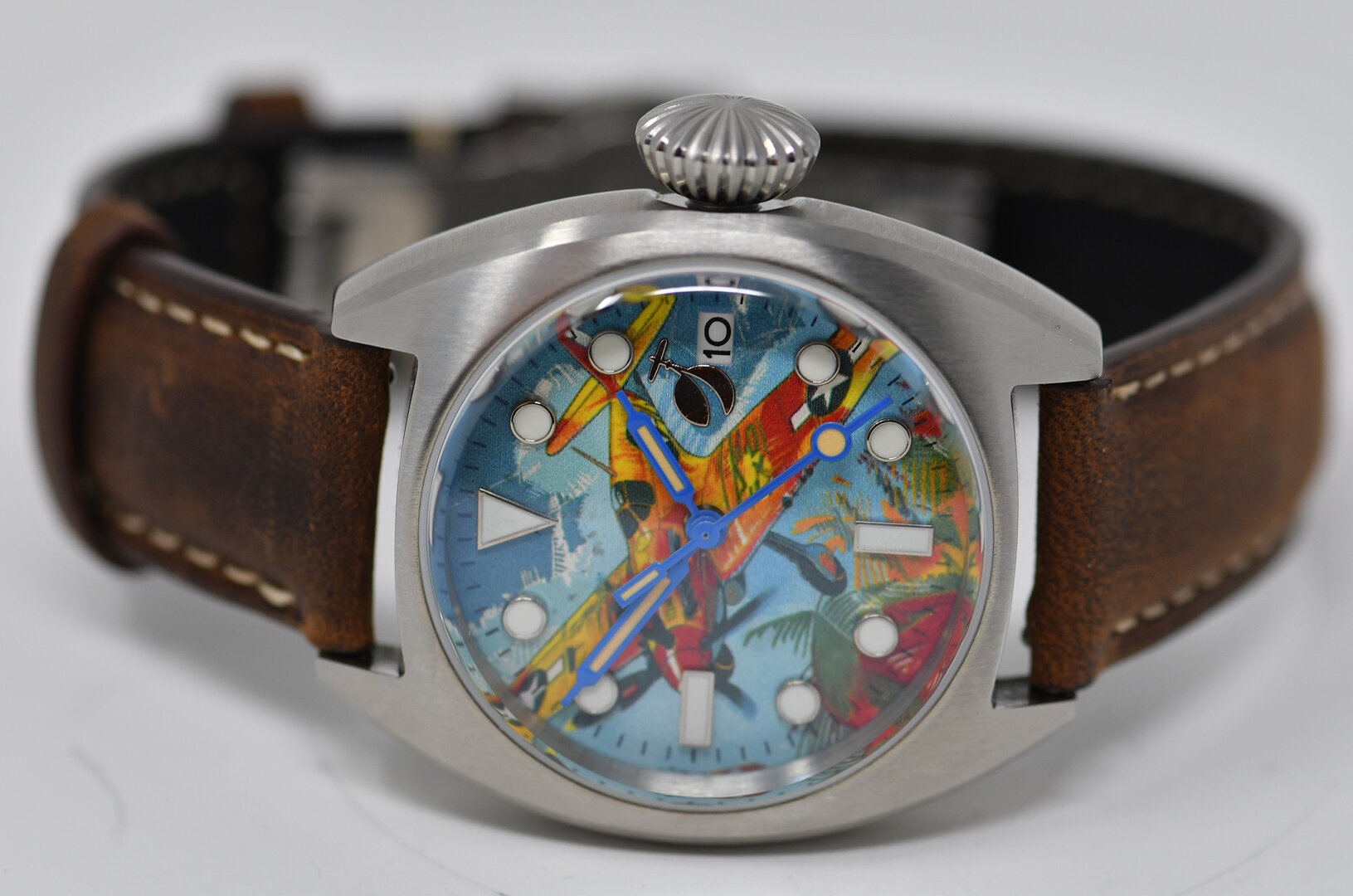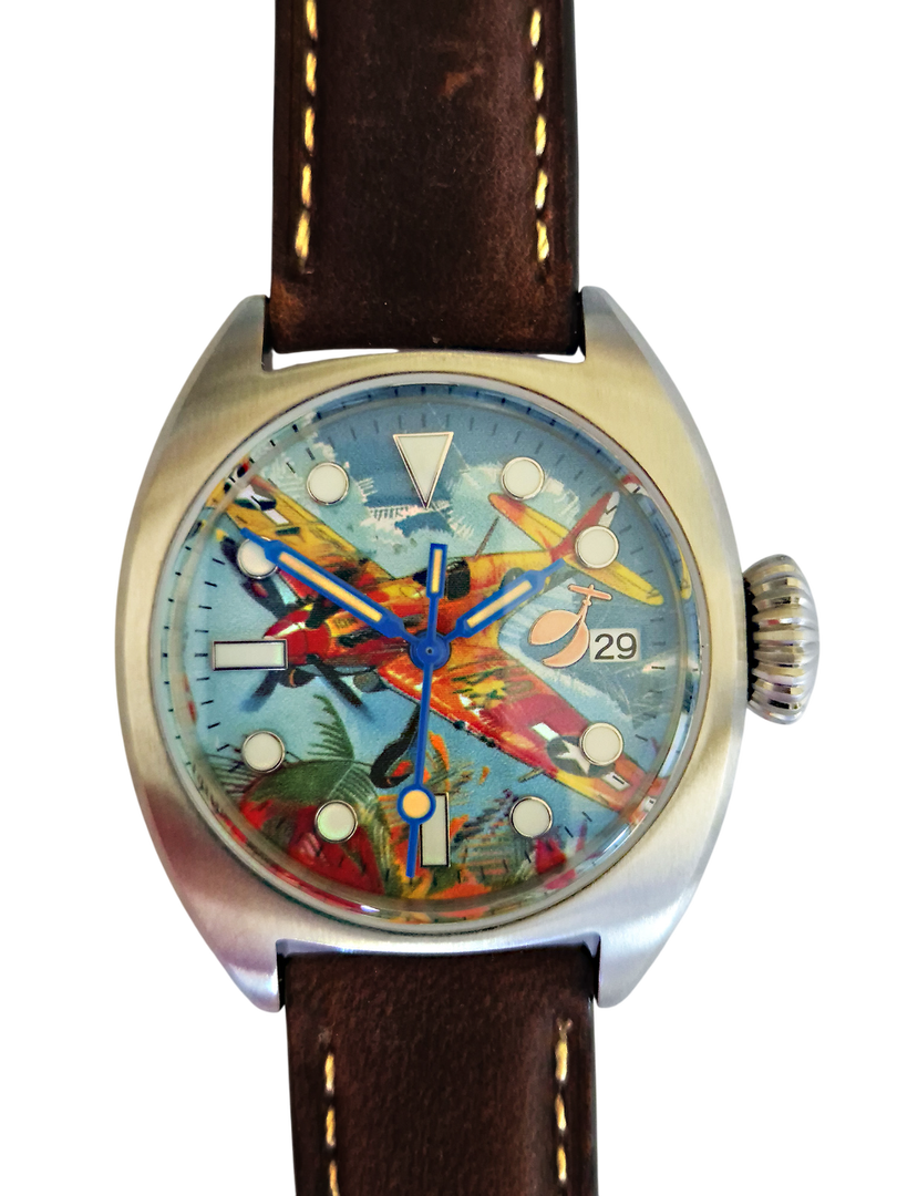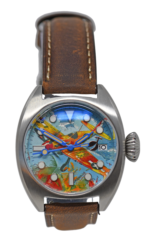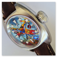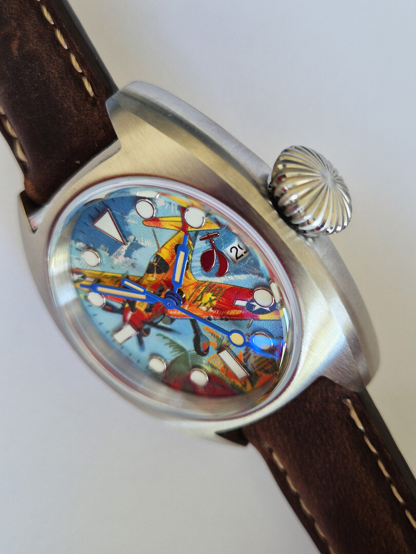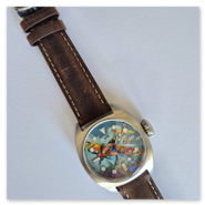 A watch with a colourful, painted aeroplane image, perfect for aviation enthusiasts! Water-resistant stainless steel case (tested to 6 bar) with sapphire crystal (hardened - scratch-resistant). Screw-down crown, brown leather strap, central second hand. Luminescent hands and indices (environmentally friendly inactive luminous material).