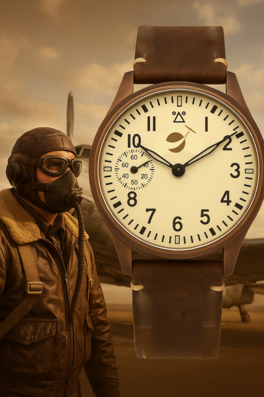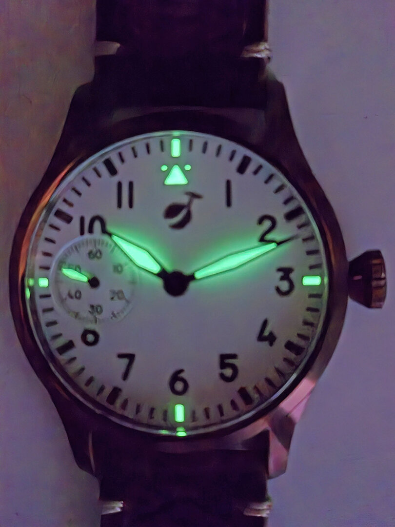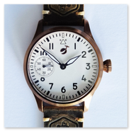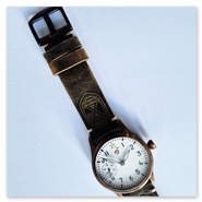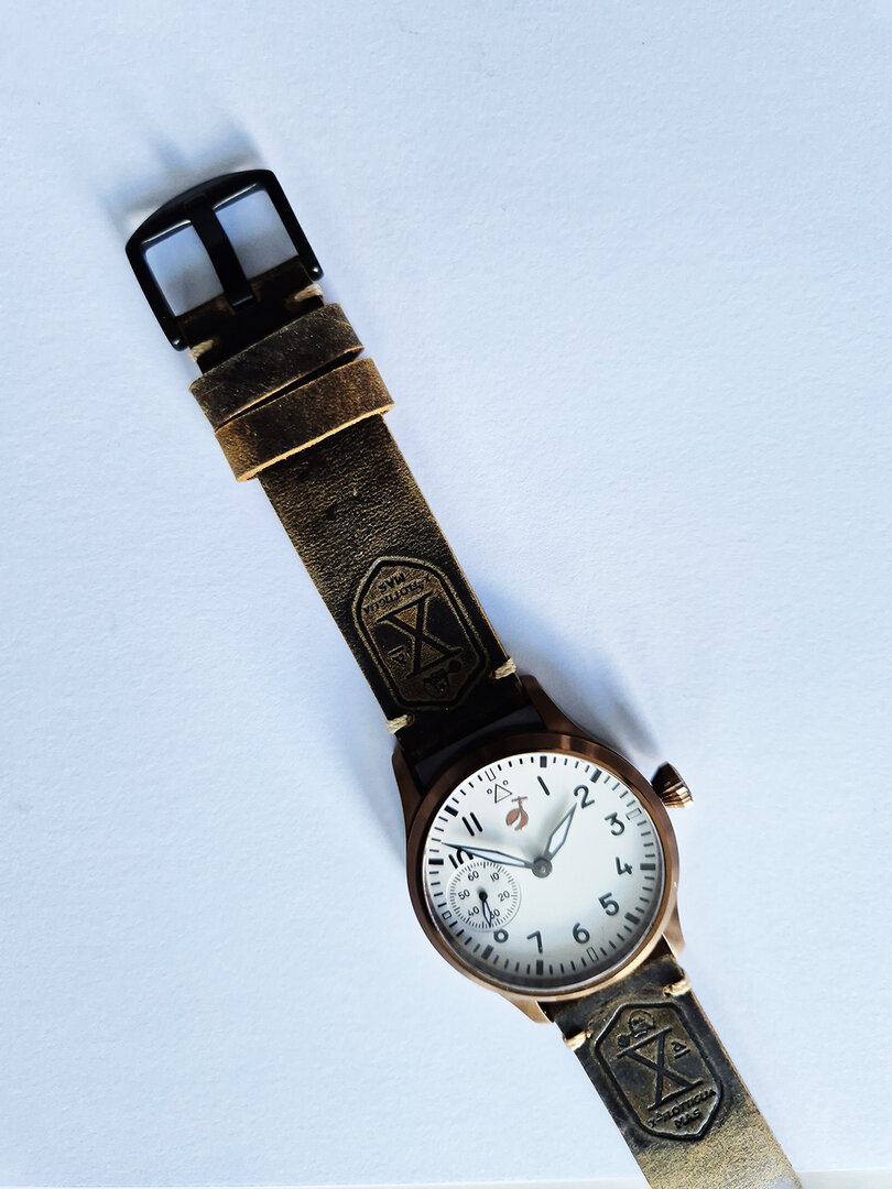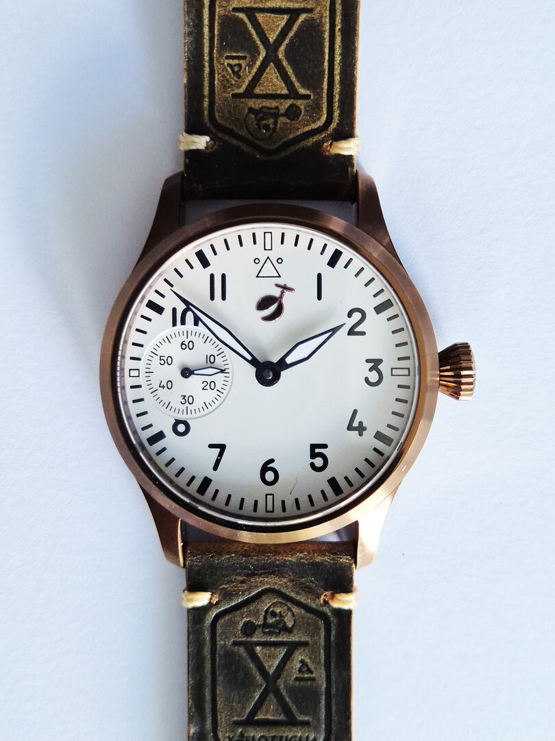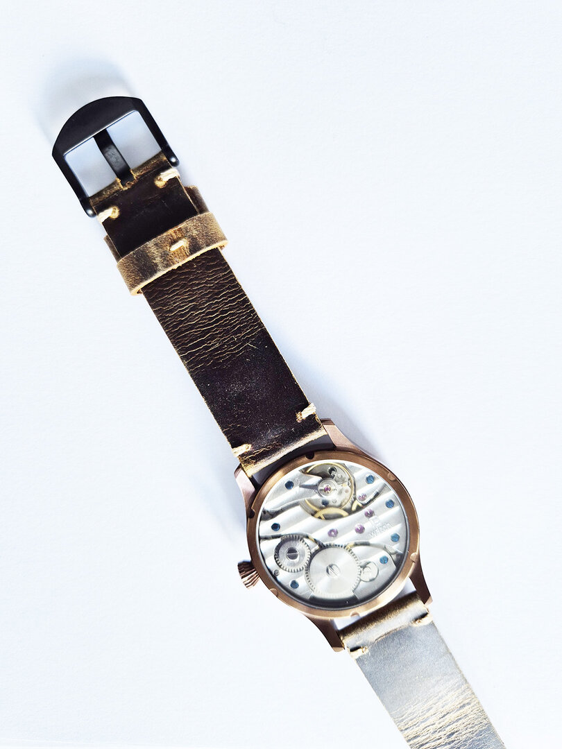 This is watch with the ST3601 movement from the factory in Hong Kong. I am very satisfied with the movement. It is very easy to adjust and seems to be very robust. A great, very simple but sophisticated design. The watch runs perfectly and is just like it used to be – you have to wind it every day. Really great! The watch has a typical pilot watch style. The bronze case goes well with the wide brown leather strap. A watch for men with stronger arms.