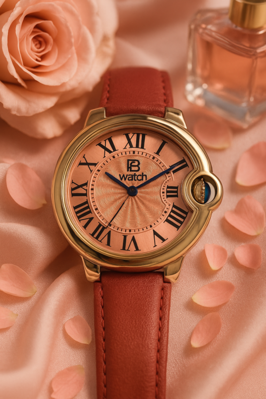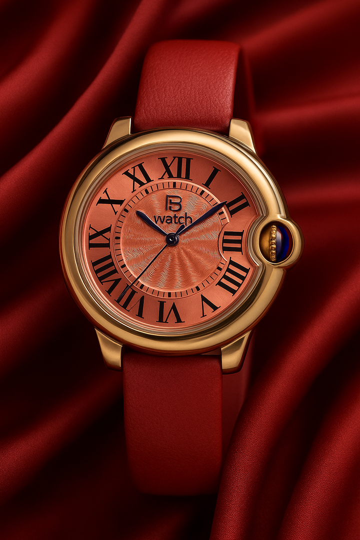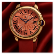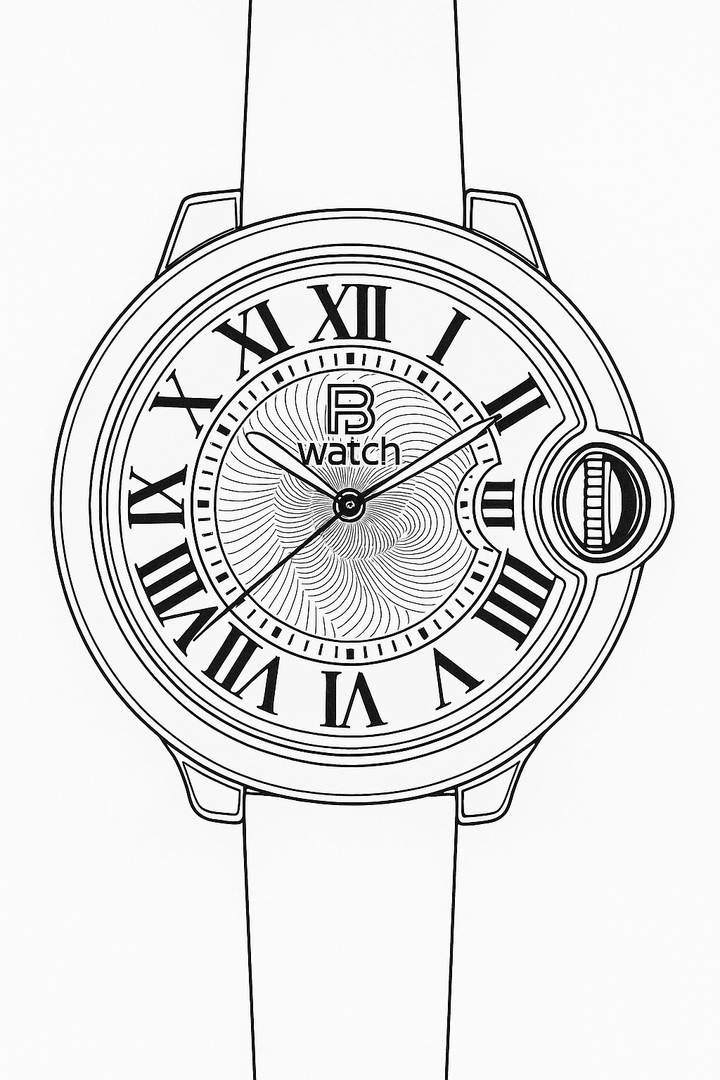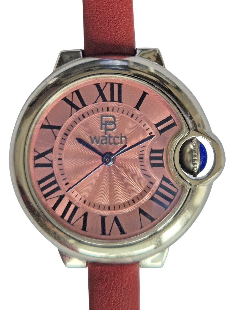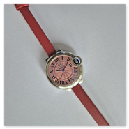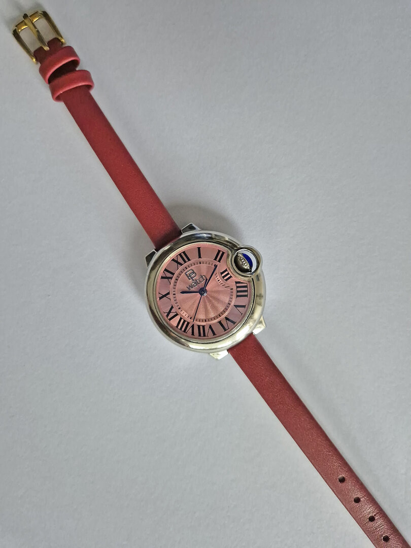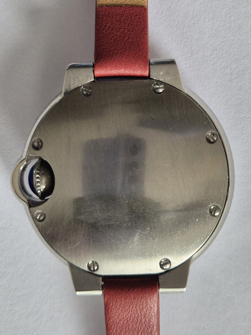 The smallest of the three watches in the series. It is modelled on the "Cartier-Ballon-Bleu" style and powered by the small Seiko NH05 movement. It is somewhat awkward to assemble the case due to the crown hidden by the surrounding case part. I think that perhaps a wider metal bracelet would make the watch look even better. The leather strap is only 8 mm wide. I think I'll try that out.