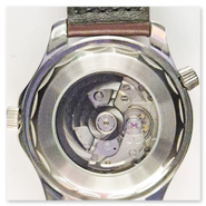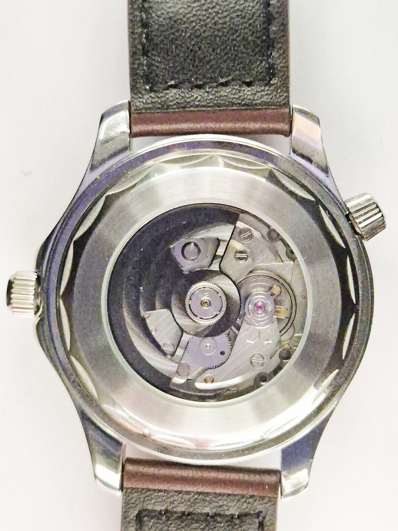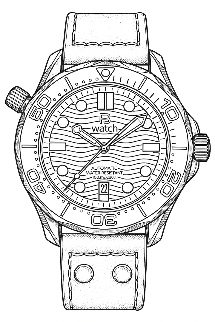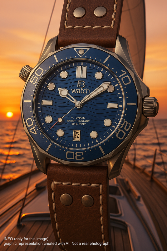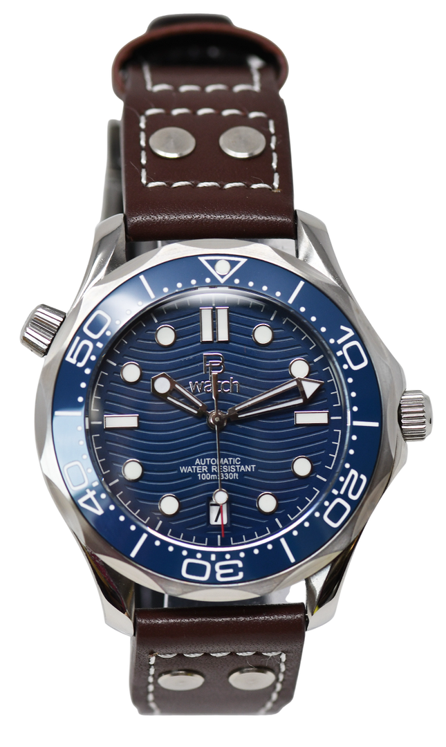 Diver-Style Automatic Watch. The design was inspired by Omega Seamaster 300 in blue ("James Bond" watch). The waterproof case with ceramic bezel, screw-down crown, sapphire crystal, exhibition window on the back side and leather strap and has a second crown, but this is only decorative and has no function. A very sporty and elegant watch designed for everyday use.