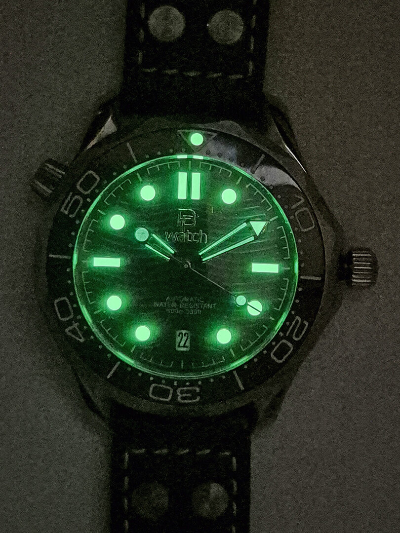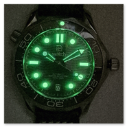 - LUME: hands, indices, chapter ring & 12 o'clock point on the bezel