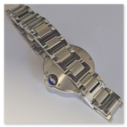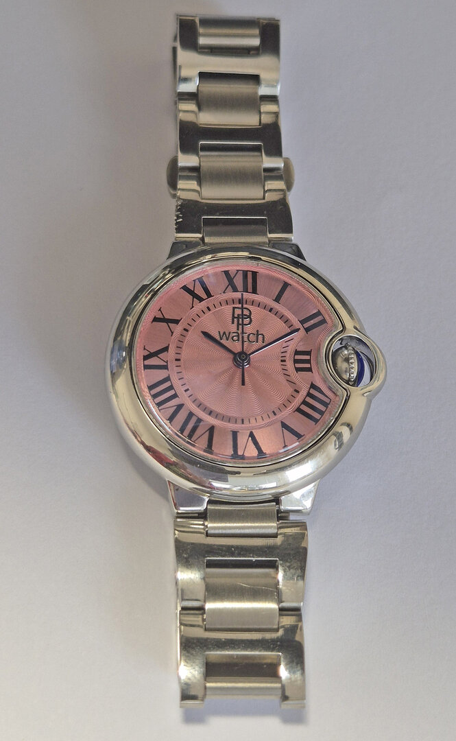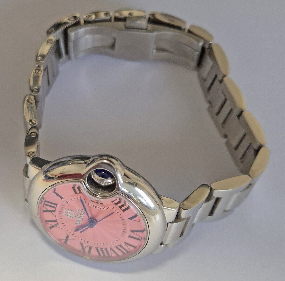 The smallest of the three watches in the series. It is modelled on the "Cartier-Ballon-Bleu" style and powered by the small Seiko NH05 movement. It is somewhat awkward to assemble the case due to the crown hidden by the surrounding case part.